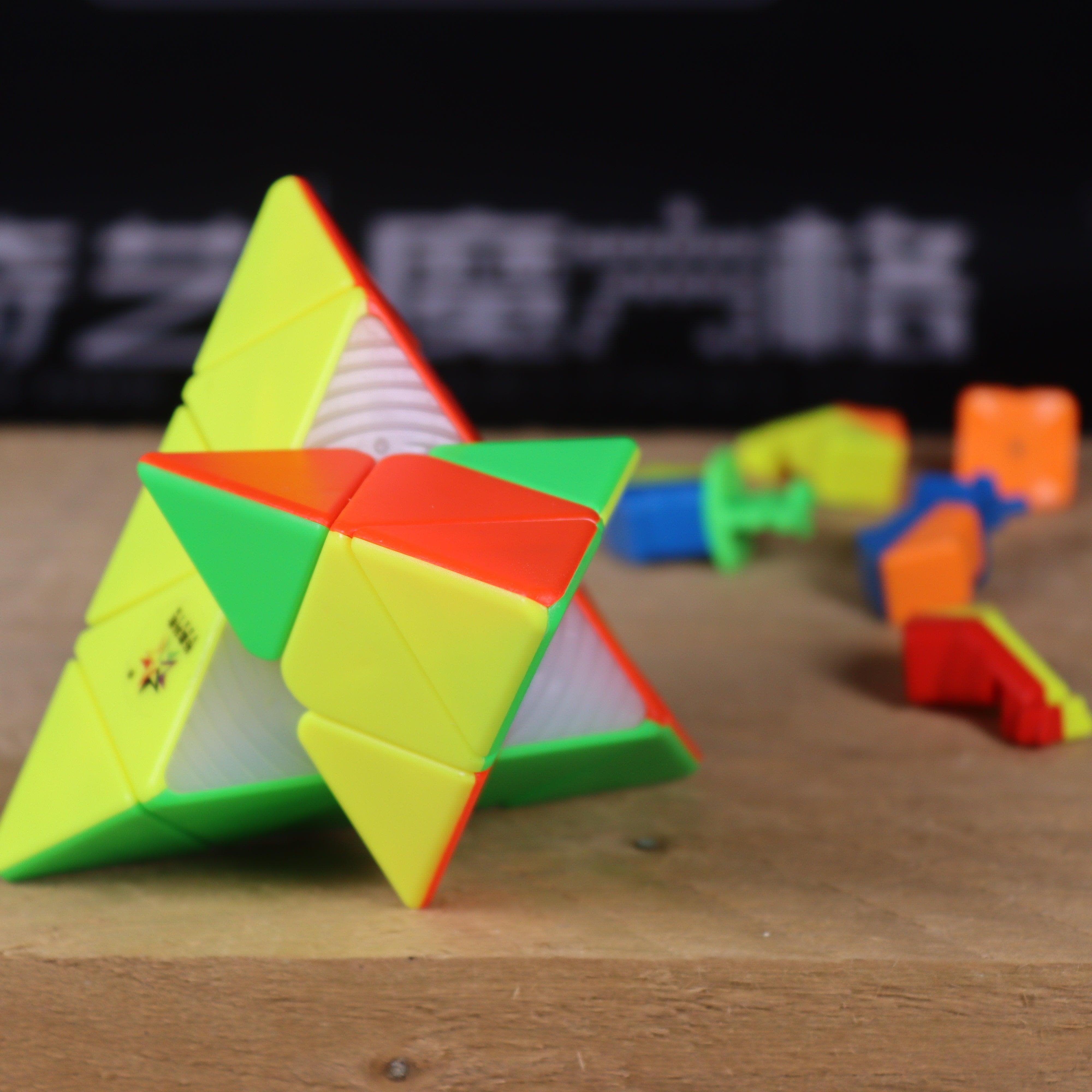 The YuXin Black Kirin Pyraminx was released in late 2018 and features steel ball bearings which act as an alignment mechanism. The outer plastic has a slightly frosted effect to improve grip and reduce scratches.