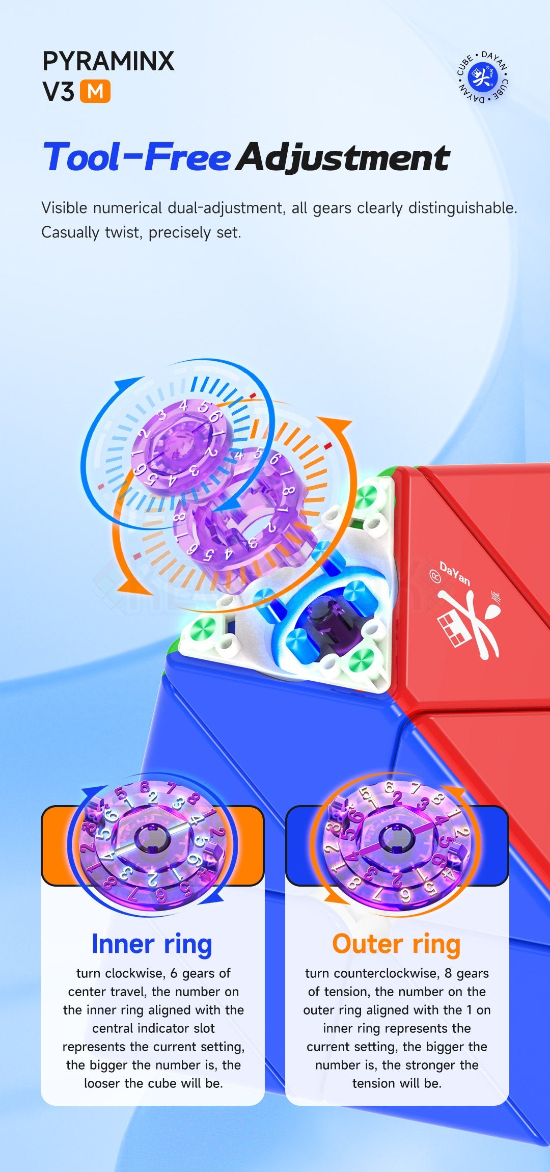 The standard version of the DaYan Pyraminx v3 has a matte exterior and obviously features the standard edge-corner magnets. Thats not all, under the tips we also find a dual tension setup that allows you to adjust the tension and elasticity and setup this pyraminx to your own turning style.