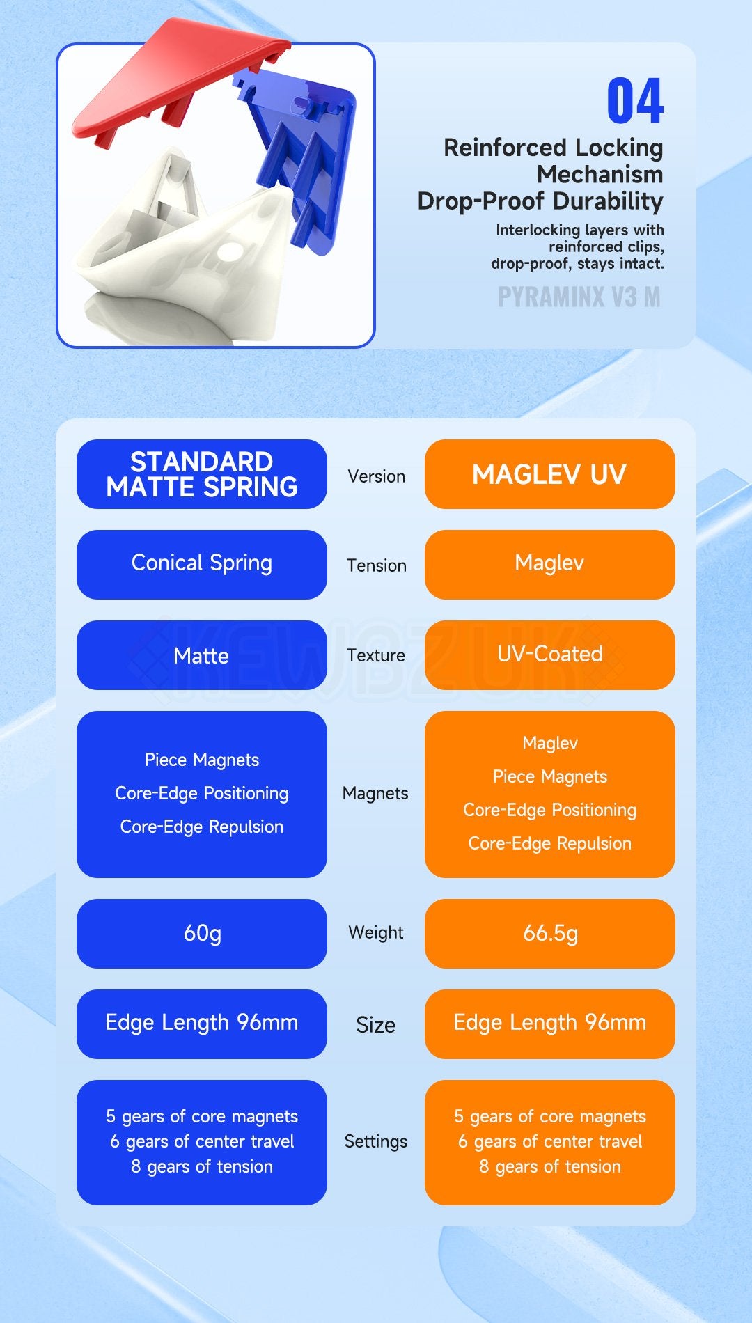 Introducing the DaYan Pyraminx v3, brand new for mid-2025 and absolutely bursting with the latest technology. The v3 standard features a ball-core with corner-core magnets that offer 5 levels of 'magnetism' (1 = min / 5 = max).